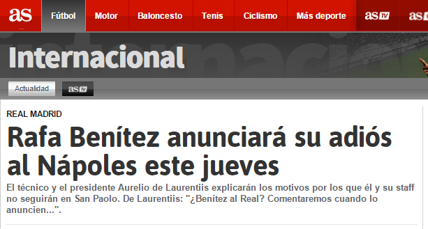 Dalla Spagna ne sono certi: “Il Napoli annuncerà l’addio a Benitez”, titolano i principali quotidiani Marca e As. (Scorri sopra le immagini).