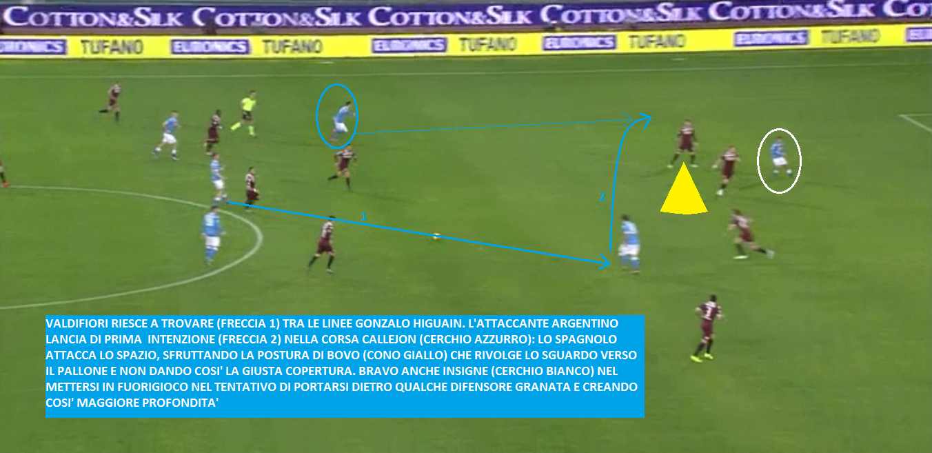 IL VANTAGGIO AZZURRO – Il Napoli riesce a sbloccare la gara al 16′ con Lorenzo Insigne. L’azione è da stropicciarsi gli occhi. C’è di tutto: verticalizzazione, attacco dello spazio e anche furbizia. Tutto parte dal passaggio filtrante di Valdifiori per Gonzalo Higuain smarcatosi perfettamente tra centrocampo e difesa granata. Mentre la sfera viaggia dai piedi di Valdifiori a quelli del ‘Pipita’, Callejon attacca lo spazio sfruttando la postura sbagliata di Cesare Bovo. Al centro dell’area poi c’è Lorenzo Insigne che si porta volutamente in fuorigioco, cercando di creare ulteriore profondità: