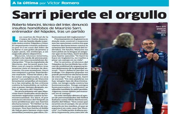 Dopo aver ricostruito la vicenda, con la denuncia di Mancini prima e le scuse di Sarri poi, Marca sottolinea che il tecnico azzurro non è nuovo a certe uscite, riportando sue dichiarazioni della stagione 2014/2015, quando ancora sedeva sulla panchina dell’Empoli. A seguito di un pareggio col Varese disse che “il calcio in Italia è diventato uno sport per femminucce, l’interpretazione del regolamento è da omosessuali. Abbiamo subito più falli noi, ce ne hanno fischiati la metà” (Sarri si infuriò per l’espulsione di Mario Rui e per un arbitraggio giudicato a sfavore dei suoi ragazzi, i quali avevano subito molti più falli degli avversari, non sanzionati dall’arbitro, n.d.r).