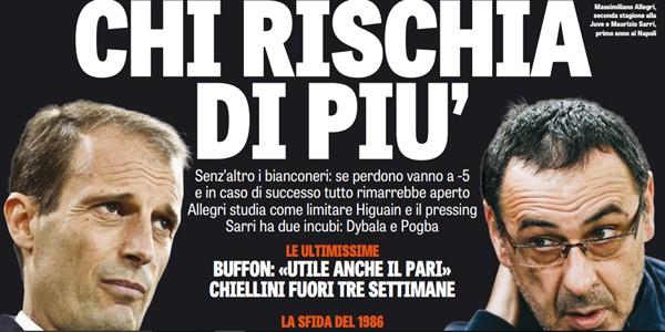 Quando si gioca, ci sono inevitabilmente dei rischi. Sarà così, anche sabato sera, quando si affronteranno Juventus e Napoli per una sfida scudetto ormai sempre più vicina. L’edizione odierna della Gazzetta dello Sport analizza per l’appunto i rischi che correranno sia Massimiliano Allegri sia Maurizio Sarri.