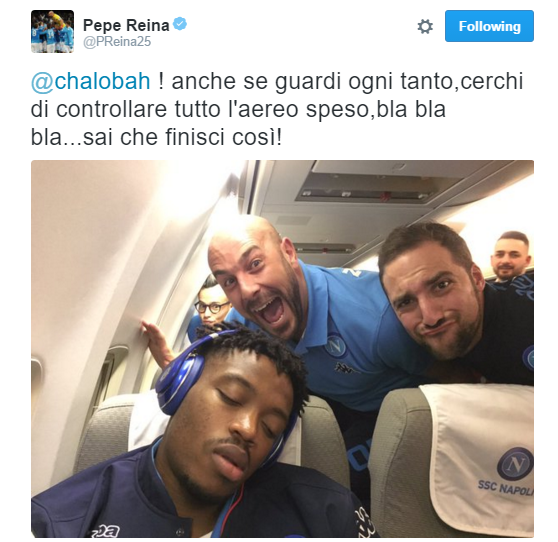 Clima disteso in aereo per il Napoli: protagonisti ancora Pepe Reina e Gonzalo Higuain, che dopo Allan e El Kaddouri se la prendono scherzosamente con…Chalobah! Ecco la foto pubblicata sul profilo twitter di Reina: