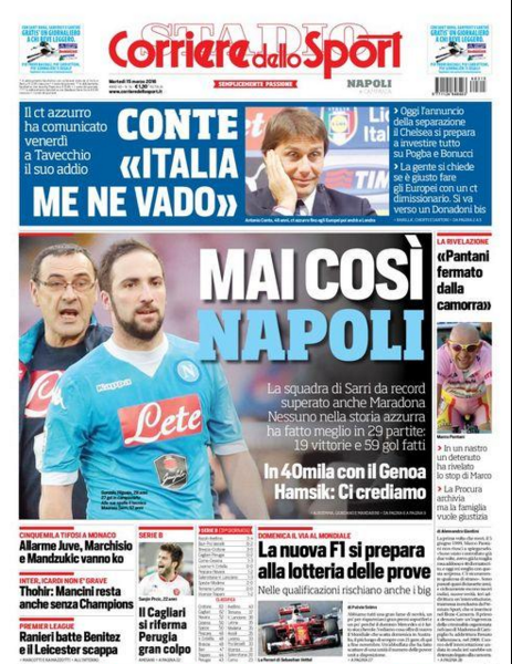 Ecco le prime pagine dei principali quotidiani. Si parte dal Corriere dello Sport (edizione Napoli e Campania), che al suo interno analizza la stagione da record del Napoli di Sarri, migliore anche di quella di Maradona. A seguire, sia la Gazzetta dello Sport che Tuttosport aprono invece con la Juventus in prima pagina in vista della trasferta di Monaco di Baviera, tra infortuni e interviste.