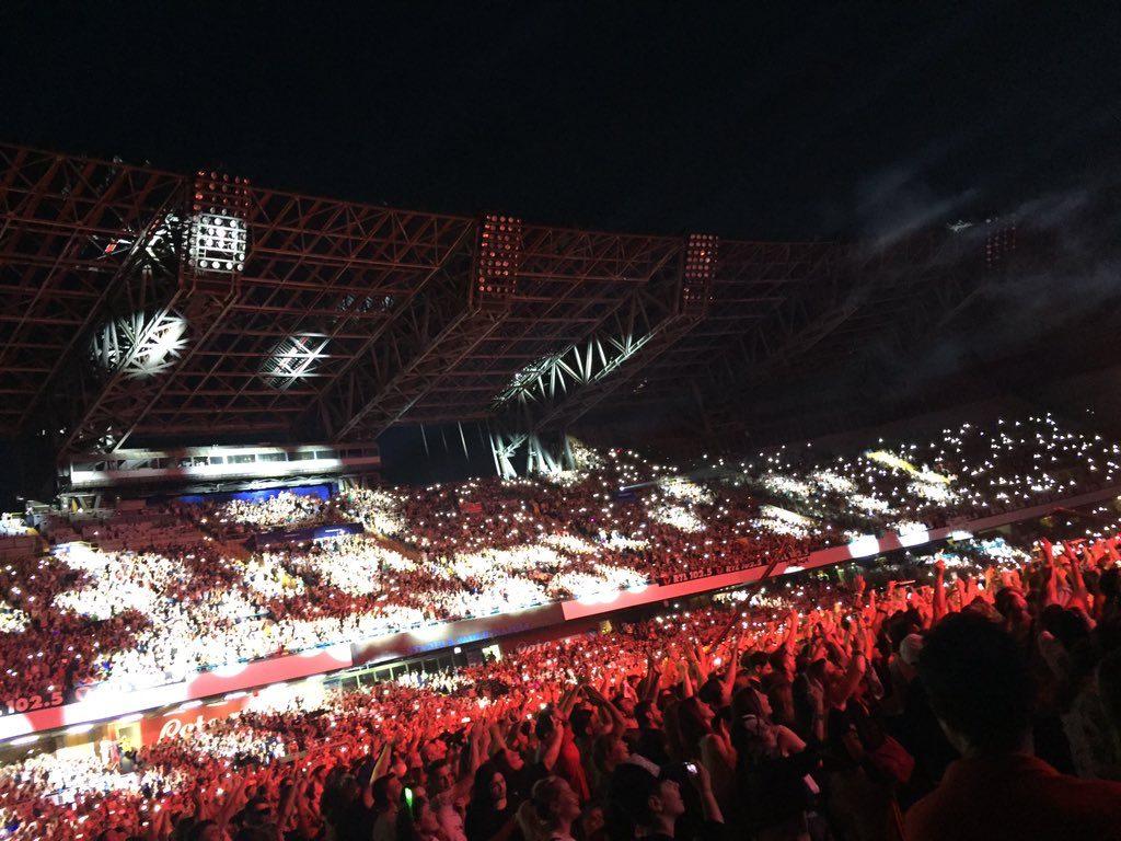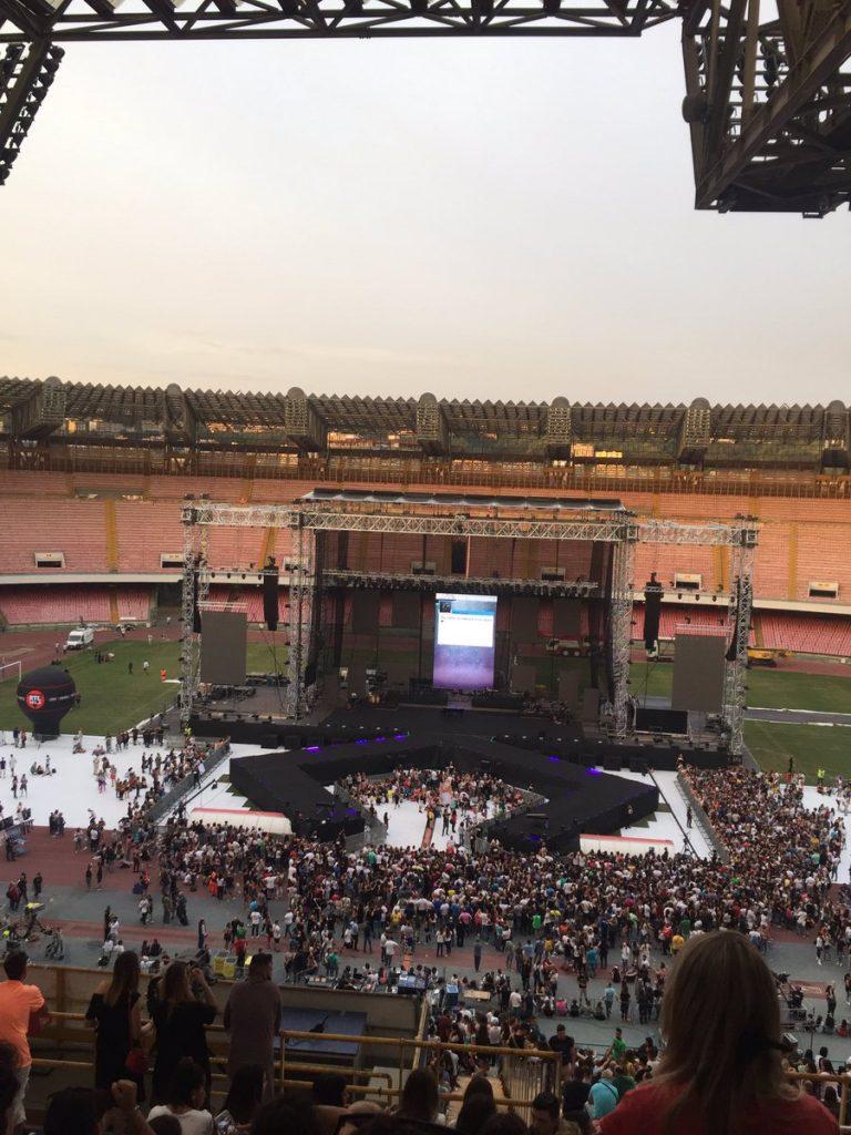Tantissimi i fan del cantautore napoletano accorse nell’impianto di Fuorigrotta dove sembra siano presenti circa 30mila persone (tanti sono i biglietti venduti). Eppure, dalle foto pubblicate sul profilo Twitter dello stesso cantante, sembra che i presenti siano molti di più (SCORRI IN ALTO LE FOTO).