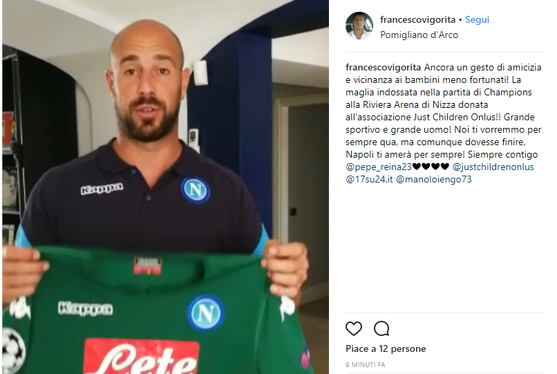 “Ancora un gesto di amicizia e vicinanza ai bambini meno fortunati! La maglia indossata a Nizza nella partita di Champions all’associazione Just Children Onlus!! Grande sportivo e grande uomo! Ti vorremmo sempre qua, ma comunque dovesse finire Napoli ti amerà sempre! Siempre contigo“