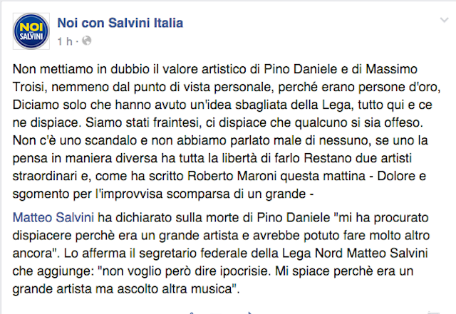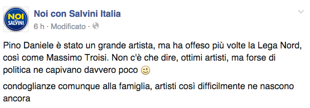“Pino Daniele è stato un grande artista, ma ha offeso più volte la Lega Nord, così come Massimo Troisi. Non c’è che dire, ottimi artisti, ma forse di politica ne capivano davvero poco. Condoglianze comunque alla famiglia, artisti così difficilmente ne nascono ancora”: questo il messaggio scritto sulla pagina Facebook “Noi con Salvini Italia”. Più tardi si è provato a raddrizzare il tiro: “Non mettiamo in dubbio il valore artistico di Pino Daniele e di Massimo Troisi, nemmeno dal punto di vista personale, perché erano persone d’oro. Diciamo solo che hanno avuto un’idea sbagliata della Lega, tutto qui e ce ne dispiace. Siamo stati fraintesi, ci dispiace che qualcuno si sia offeso. Non c’è uno scandalo e non abbiamo parlato male di nessuno, se uno la pensa in maniera diversa ha tutta la libertà di farlo. Non voglio però dire ipocrisie. Mi spiace perchè era un grande artista, ma ascolto altra musica”.