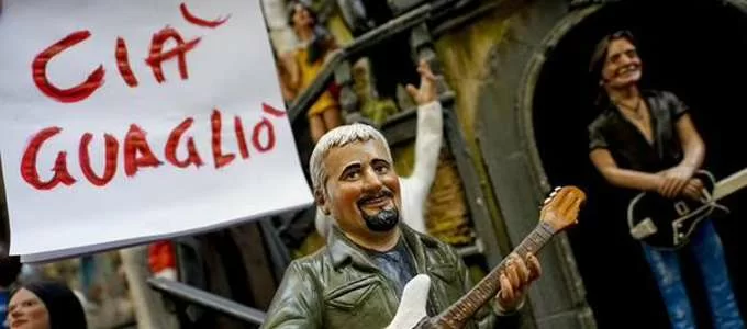 Questa mattina a San Gregorio Armeno, una dei luoghi simbolo della città, accanto alla statuetta di terracotta che rappresenta il cantante napoletano è apparso il cartello con su scritto: “Ciao guagliò“.
