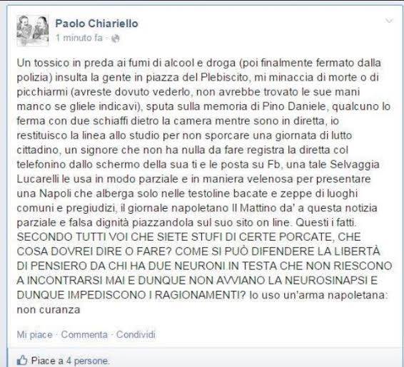 Poi si scaglia anche contro l’inviato di Sky, Paolo Chiariello. Il giornalista partenopeo, aveva scritto un post contro la Lucarelli sullo stesso social network: