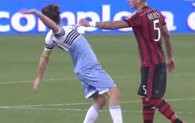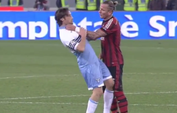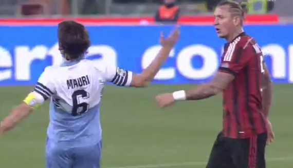 Brutto episodio poco prima del fischio finale di di Lazio-Milan. Mexes si è lasciato andare ad un brutto gesto nei confronti di Stefano Mauri ed è stato espulso. Il biancoceleste poco prima aveva rifilato un “calcetto” al difensore milanista. Guardate la risposta del francese… (Sopra la sequenza foto)