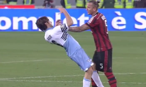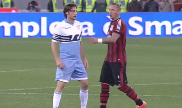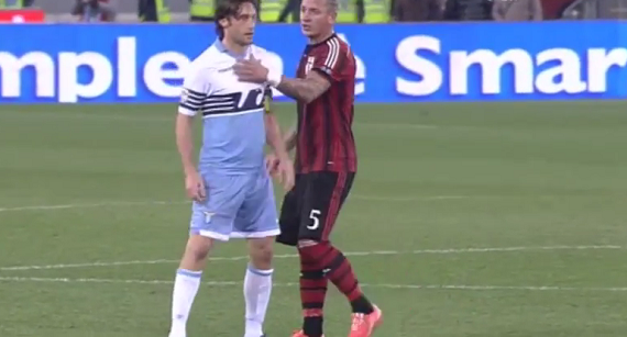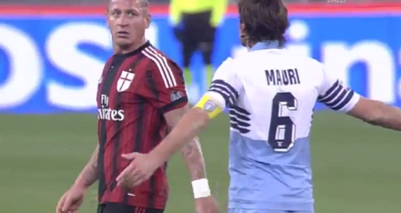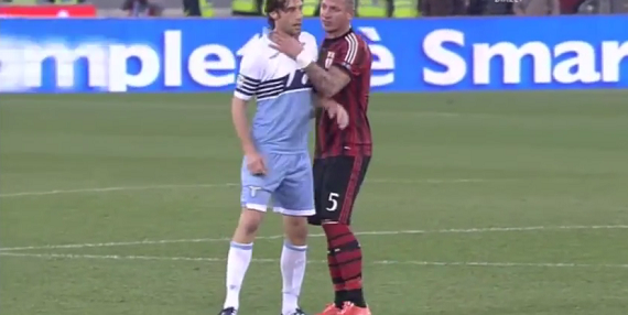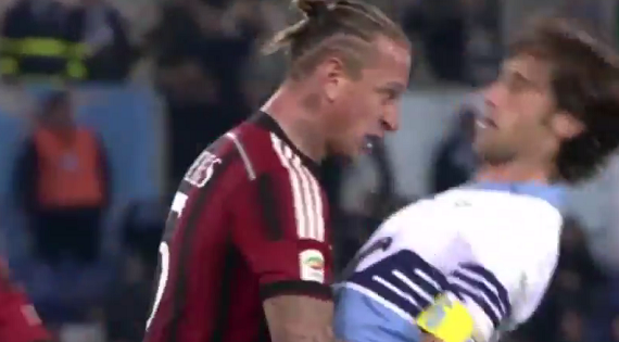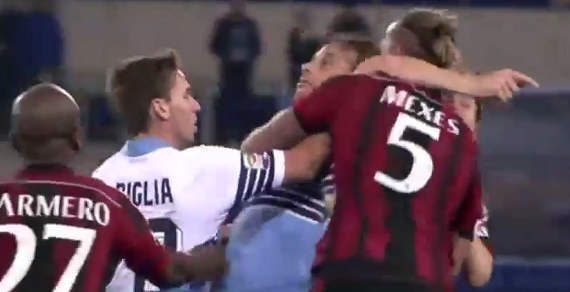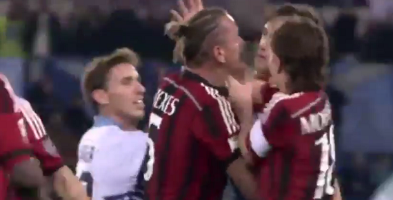 Brutto episodio poco prima del fischio finale di di Lazio-Milan. Mexes si è lasciato andare ad un brutto gesto nei confronti di Stefano Mauri ed è stato espulso. Il biancoceleste poco prima aveva rifilato un “calcetto” al difensore milanista. Guardate la risposta del francese… (Sopra la sequenza foto)