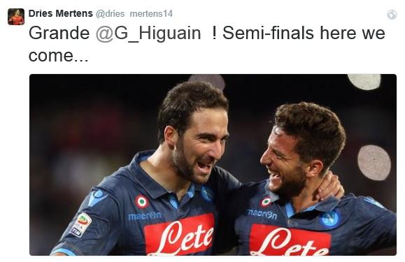 L'ala del Napoli Dries Mertens ha affidato a Twitter la sua gioia per la vittoria nei quarti di finale di Coppa Italia contro l'Inter, allegando una bellissima foto con Higuain. Ecco quanto ha scritto. "Grande Gonzalo! Semifinali, stiamo arrivando!"