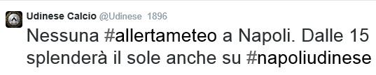 Bellissimo il tweet dell’Udinese, che a poche ore dal match contro il Napoli non perde occasione per ricordare le bellezze della terra partenopea, con due foto splendide della città. “Nessuna allerta meteo a Napoli, dalle 15 il sole splenderà anche su Napoli-Udinese”.