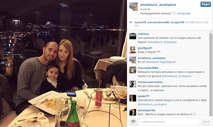A svelarlo è stata la moglie del calciatore, Anna Laura Acampora, che dal suo profilo Instagram ha postato una foto ritraente l’intera famiglia Sepe intenta a festeggiare l’accordo raggiunto. Eloquente il messaggio che accompagna la foto: “Festeggiamenti rinnovo!“.