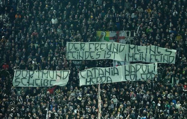 Se, come hanno detto in molti “lo sfottò nel calcio è sempre esistito”, seppur sia obbligatoria una giusta e dovuta distinzione tra un coro che schernisce in senso lato gli avversari ed uno che offende un’intera popolazione inneggiandone persino alla morte, è paradossale ed assurdo che lo stesso si rinnovi persino in assenza del soggetto preso di mira. Odio gratuito, insomma. Due esempi su tutti: Celtic-Inter, Europa League, giovedì 19 febbraio. Ecco che, in diretta tv, si ascoltano i soliti cori dei tifosi nerazzurri all’indirizzo di Napoli e dei napoletani, ovviamente neanche compresi dai supporter biancoverdi. Una vera e profonda vergogna che ha fatto il giro del Mondo, sotto i riflettori di tutta Europa. Come se non bastasse, arriviamo a ieri. Torino, match di Champions League tra Juventus e Borussia Dortmund. Agli occhi dei tifosi della Vecchia Signora, la squadra tedesca si è macchiata di due colpe: la prima, avere tra le proprie fila il napoletanissimo Ciro Immobile, la seconda ed ancor più grave, avere una spiccata simpatia per il Napoli ed i suoi tifosi. Ed ecco, che insieme ai cori arriva persino lo striscione accusatorio, antisportivo, gravissimo, che fa nuovamente il giro d’Europa scatenando ancora le più profonde ire e la grande indignazione di un popolo che, anche in questo caso, non ha fatto nulla per essere chiamato gratuitamente in causa.