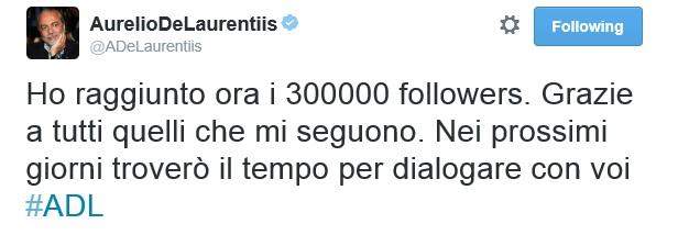 Tweet pomeridiano del presidente del Napoli Aurelio De Laurentiis che ringrazia i suoi 300.000 follower sul noto social network. In più, una bella sorpresa in cantiere, probabilmente un nuovo “Ask ADL” come negli scorsi anni, per interagire con tutti i tifosi.