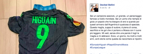Una tripletta, e la maglia regalata a chi ha fatto risuonare il suo nome al San Paolo dopo ogni gol: Gonzalo Higuain si conferma campione in campo e fuori. Questo il post lasciato su Facebook da Daniele Decibel Bellini, speaker del San Paolo cui ieri sera l’attaccante argentino ha regalato la maglia indossata contro la Dinamo Mosca: “Sei un campione assoluto, un grande, un personaggio famoso a livello mondiale. Sei un uomo che riempie di gioia un popolo che ha bisogno di eroi e quando poi questi arrivano dall’Argentina é qualcosa di speciale. Questa maglia, zuppa di sudore, é piena di corsa, sacrificio e tre gol che ci portano a Mosca con il cuore più leggero. Mi vedi, senza dire una parola ti togli la maglia e mi abbracci. Ecco, un giorno, tra molti e molti anni, avrò storie come questa da raccontare ai nipotini”.