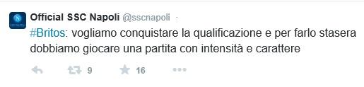 Il difensore del Napoli Miguel Angel Britos suona la carica in vista del match di Europa League contro la Dinamo Mosca in programma tra poco più di un’ora. Ecco quanto riporta il profilo ufficiale Twitter del Napoli.