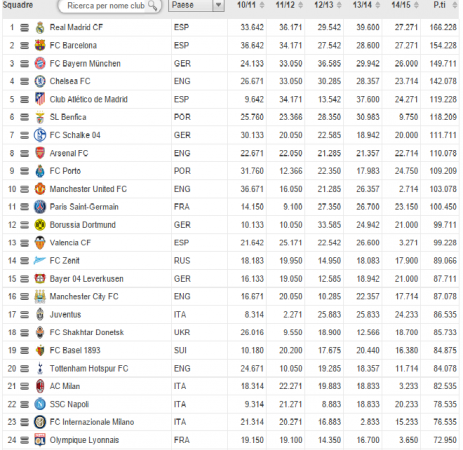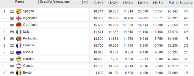 Nella classifica della stagione 2014-15 l’Italia è seconda (16.166) a pochi punti dalla Spagna (16.357), la nazione con più squadre nelle competizioni europee (Siviglia in EL, Atletico Madrid, Real Madrid e Barça in Champions). Terza la Germania con 15.000 punti e due club (Wolfsburg in Europa League e Bayern in CL). Quarta l’Inghilterra (13.571) che chiude una stagione disastrosa, senza nessuna squadra in corsa nelle competizioni europee dai quarti in poi: eliminati infatti tutti club, dopo la pesante sconfitta dell’Everton contro la Dinamo Kiev. Risultato che sicuramente peserà in futuro (ricordiamo che l’Uefa considera solamente gli ultimi 5 anni per il ranking). Adesso non resta che aspettare i due sorteggi: Champions alle 12 ed Europa League alle 13, con la speranza di evitare gli spauracchi.