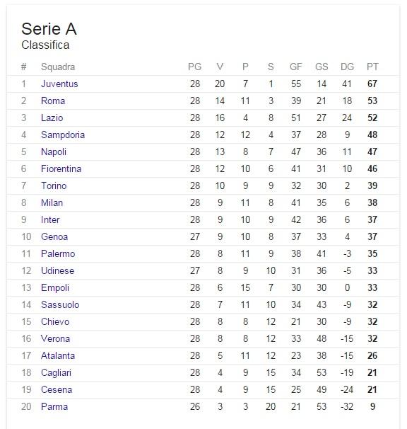 La classifica, adesso, si fa sempre più preoccupante per il Napoli. Ecco la graduatoria: