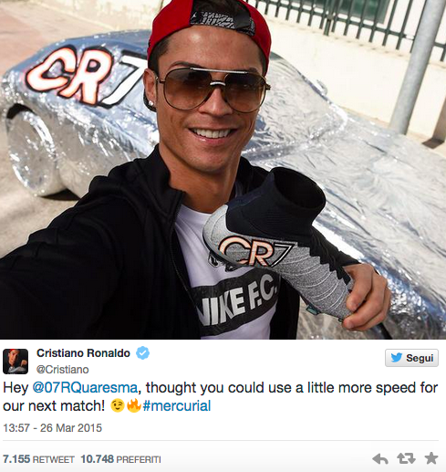 Uno scherzo che sa tanto di trovata pubblicitaria. E’ quello che ha fatto Cristiano Ronaldo al suo amico e compagno di Nazionale Quaresma: gli ha avvolto l’auto interamente nella carta stagnola, per renderla dello stesso colore delle sue nuove scarpe. E poi ha postato in bella mostra la foto su Twitter