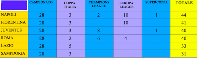 PRIMATO – La squadra di Benitez ha giocato più di tutti, come dimostra la tabella che vi proponiamo in basso: 44 partite tra preliminari di Champions League, Campionato, Coppa Italia, Supercoppa Italiana ed Europa League. E se le due gare contro l’Athletic Bilbao sono state sicuramente un crocevia negativo della stagione, nelle altre manifestazioni non si può dire che la squadra abbia avuto un cammino deludente, anzi: semifinale di Coppa Italia con un piede e mezzo in finale, quarti di finale di Europa League da giocare, e un piazzamento Champions da provare a conquistare in questo finale thrilling di campionato. In cui, è ovvio, una forza in più l’avrà chi fino a questo momento ha giocato di meno, vale a dire Sampdoria e Lazio, scese in campo rispettivamente 31 e 33 volte. Un vantaggio non da poco.