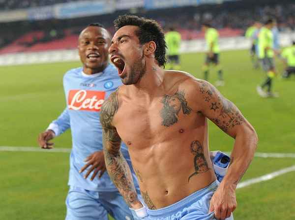 LAVEZZI DESNUDO – Sempre sopra la righe Ezequeil Lavezzi, spesso in gol e sotto la curva senza maglia…Giallo sistematico e standing ovation dei tifosi.