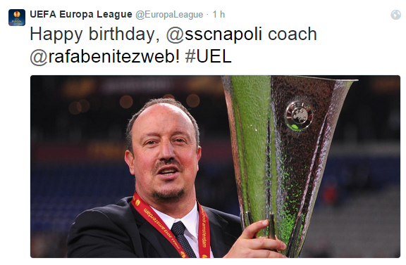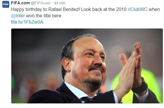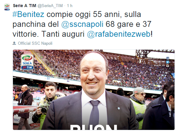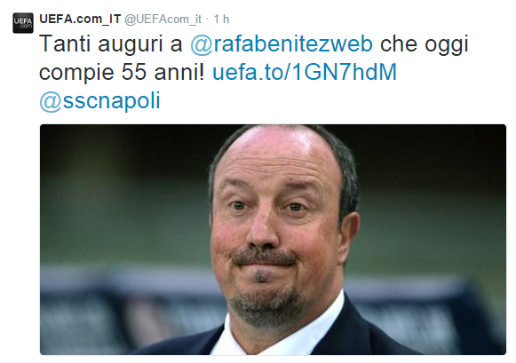 FOTO – Gli auguri di Uefa, Fifa e Serie A Tim a Rafa Benitez 16 Apr 2015 - 11:29 di redazione Oggi è il compleanno di Rafa Benitez e le maggiori istituzioni calcistiche l’hanno celebrato così… (SCORRI LE FOTO) redazione