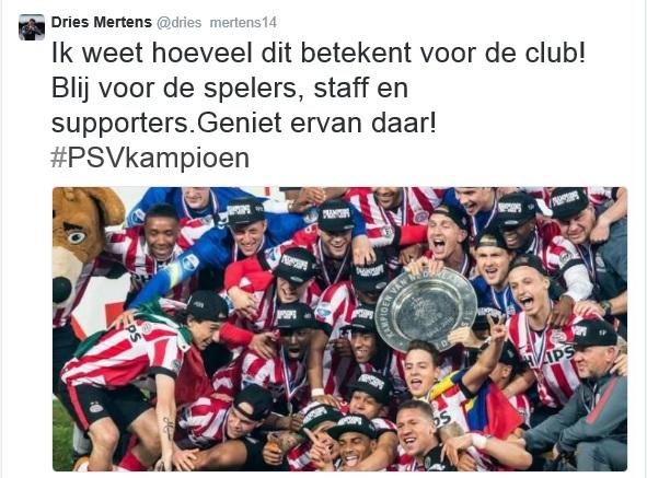 Chi ama non dimentica. E’ questo il motto degli ultras ma anche di vari calciatori che non dimenticano le belle esperienze vissute con maglie diverse da quella attuale. Tappe importanti di una carriera plasmata con cura, passione e dedizione in giro per il Mondo, lasciando un pezzo di cuore altrove. E’ questo il caso di Dries Mertens che, prima di arrivare al Napoli, era una stella del Psv Eindhoven. E’ proprio il club olandese oggetto del suo tweet di qualche minuto fa. Tempestivi, i complimenti del campione partenopeo agli ex compagni di squadra per la vittoria del campionato, con una bellissima foto allegata.