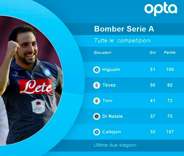 Una curiosa statistica vede primeggiare Gonzalo Higuain su tutti nel campionato italiano. Dalle statistiche del sito Opta vien fuori che nessuno nelle ultime due stagioni ha segnato quanto il Pipita. L’argentino è in testa a questa speciale classifica con ben 51 gol realizzati in 100 presenze, segue Tevez con 50 reti, più staccati gli altri inseguitori: Toni (41) Di Natale (37) e Callejon (32).