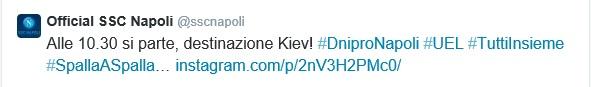 Il Napoli è in partenza per Kiev, dove affronterà domani sera la semifinale di ritorno di Europa League contro la Dnipro. Nel mirino la finalissima di Varsavia ma prima ci sarà da superare lo scoglio dell’undici ucraini, reduci da un pari al “San Paolo”. La truppa partenopea è a Capodichino in attesa del volo delle 10.30 così come riportato proprio su Twitter dal profilo ufficiale partenopeo.