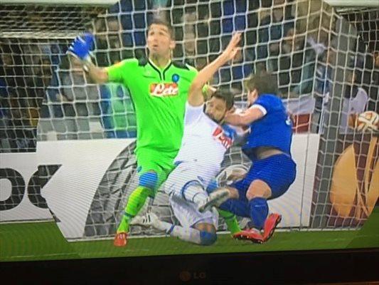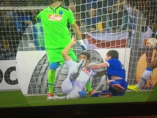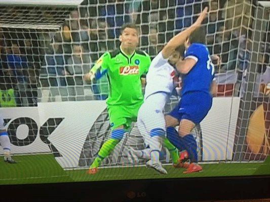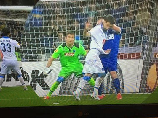 GOL DNIPRO – “Non ci sono dubbi: gol della Dnipro da annullare assolutamente. L’attaccante si aggrappa con tutte e due le mani a Britos. L’arbitro era posizionato bene ma non ha fischiato. Grave errore. La mano destro di Seleznyov trattiene la maglia di Britos che si allunga, mentre la mano sinistra che si avvinghia al collo del difensore azzurro così che non possa muoversi.”