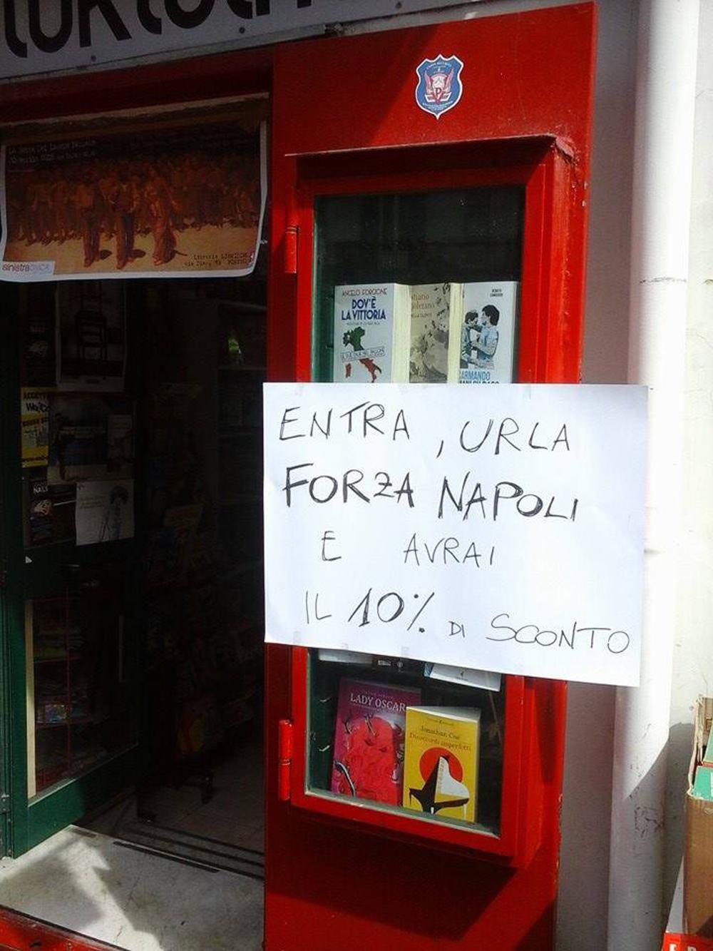 L’attesa aumenta il desiderio, ma non solo quello. A Napoli, nel caldo clima che si prepara alla trasferta di Kiev, qualcuno ha ben pensato di dar sfogo alla fantasia. Luogo ancora misconosciuto, ma idee molto chiare: un cartello all’entrata di una libreria accoglie i tifosi azzurri invitandoli ad acquistare e smaltire la tensione in vista di stasera. Questa la foto riproposta da Napospia.it