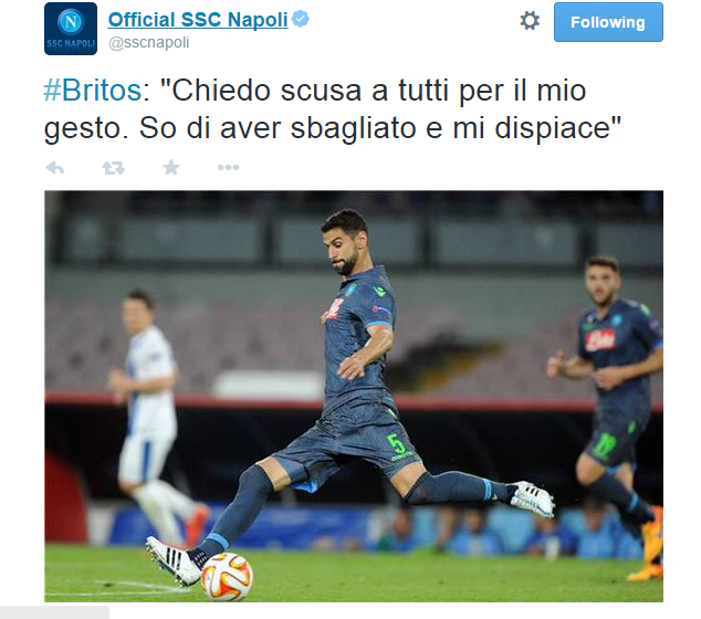 Immancabili sono arrivate le scuse dell’uruguaiano tramite il profilo Twitter ufficiale del Napoli: “Chiedo scusa a tutti per il mio gesto. So di aver sbagliato e mi dispiace”.