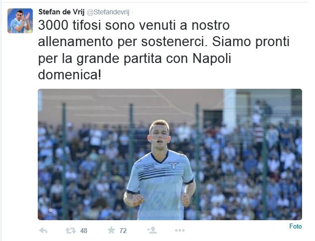 Il big match tra Napoli e Lazio si avvicina ed i protagonisti delle due squadre sono particolarmente carichi, a caccia della Champions. Tra questi anche Stefan De Vrij, che poco fa ha pubblicato sul suo profilo ufficiale di Twitter un messaggio inequivocabile.