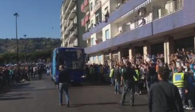 All’arrivo del pullman del Napoli allo stadio, un’enorme folla di supporters ha accompagnato l’ingresso del mezzo nel parcheggio. Grande incitamento ma anche un messaggio ben preciso da parte degli ultras che hanno gridato: “Fuori le p….”.