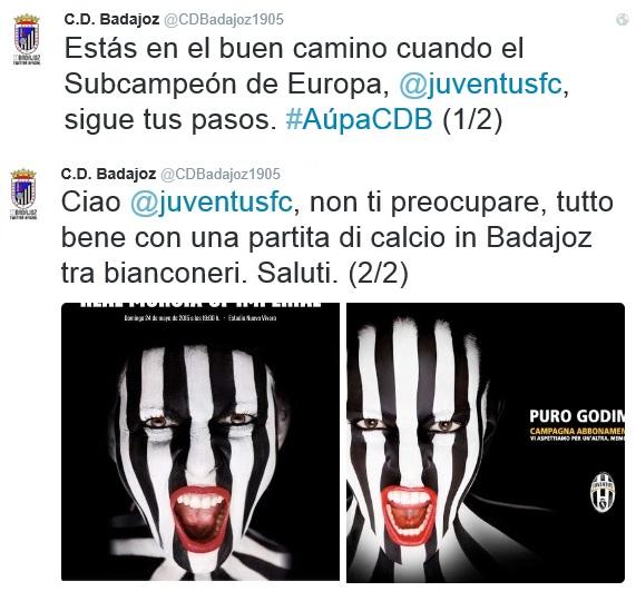 Si tratta del Badajoz, compagine spagnola di Terza Divisione, che aveva già utilizzato un manifesto alquanto identico per convogliare i tifosi nei big match di campionato. Ecco che scatta l’accusa su Twitter, con un sarcasmo davvero fantastico ed una soluzione non da poco. “Si è sulla strada giusta se i vicecampioni d’Europa seguono le tue orme. Ma non preoccuparti Juve: risolviamo tutto con una bella amichevole a Badajoz. Saluti” si legge sul profilo ufficiale del team sul noto social.
