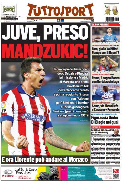 Juventus in primo piano sulla prima pagina di oggi, venerdì 19 giugno, di Tuttosport. Il quotidiano torinese riporta le cifre di quello che ormai è un affare concluso tra Juventus ed Atletico Madrid: 18 milioni agli spagnoli per il cartellino di Mario Mandzukic, al croato un contratto da 4 milioni a stagione fino al 2019.
