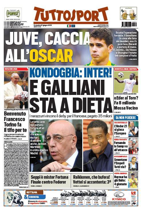 Spazio a Kondogbia e al suo passaggio all’Inter sulla prima pagina di oggi, domenica 21 giugno, di Tuttosport. “Kondogbia all’Inter, e Galliani sta a dieta“, questo il titolo in primo piano che rimarca come le tante cene fatte dall’ad milanista con i propri obiettivi di mercato non portino per niente bene. Ora rischia di saltare anche Jackson Martinez che è entrato in orbita Atletico Madrid. Taglio alto dedicato alla Juventus: “Juve, caccia all’Oscar“, in riferimento al trequartista del Chelsea che Max Allegri avrebbe messo in cima alla propria lista dei desideri. Anche Isco e Jovetic potrebbero essere obiettivi per i bianconeri.