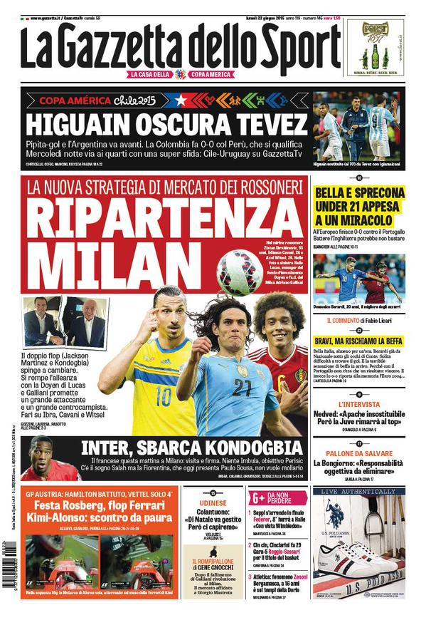 Titolo dedicato al Milan sulla prima pagina di oggi, lunedì 22 giugno, della Gazzetta dello Sport. “Ripartenza Milan“, dopo i flop per le trattative di Jackson Martinez e Kondogbia si punta ad un centrocampista di spessore (Witsel) e ad un grande attaccante (Cavani o Ibrahimovic). Di spalla titolo dedicato alla nazionale Under 21 di Gigi Di Biagio che ha pareggiato per 0-0 contro il Portogallo nella seconda giornata del proprio girone: “Bella e sprecona, Under 21 appesa a un miracolo“.