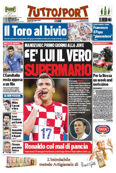 Juventus in primo piano sulla prima pagina di oggi, lunedì 22 giugno, di Tuttosport. “È lui il vero Super Mario“, riferimento al nuovo attaccante bianconero, Mario Mandzukic, appena acquistato dall’Atletico Madrid. Di spalla tantissimo mercato, si parte dal Milan: “Ibra o Cavani per l’attacco“, poi spazio all’Inter: “Prima vendere, poi assalto a Salah“.