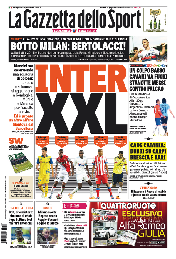 Titolo dedicato all’Inter sulla prima pagina di oggi, venerdì 26 giugno, della Gazzetta dello Sport: “Inter XXL“, resoconto sul mercato dei nerazzurri e sui possibili obiettivi da qui in avanti. In taglio alto: “Botto Milan: Bertolacci!“.