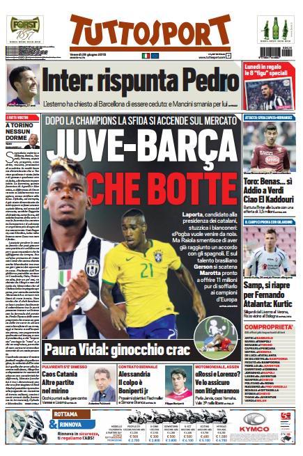 Mercato legato alla Juventus sulla prima pagina di oggi, venerdì 26 giugno, di Tuttosport: “Juve-Barça, che botte“, titolo che si riferisce alla volontà della società spagnola di acquistare Pogba dai bianconeri. I due club si sfidano anche per accaparrarsi il brasiliano Gerson. In taglio alto spazio all’Inter è ad un nuovo nome per l’attacco: Pedro Rodriguez del Barcellona.