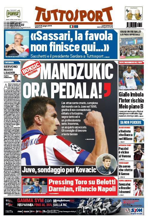 Intervista all’ex attaccante di Juventus e Lazio, Alen Boksic, sulla prima pagina di oggi, lunedì 29 giugno, di Tuttosport: “Mandzukic, ora pedala!“. Di spalla l’Inter che ora punta su Felipe Melo visto il forte rischio di perdere Imbula tentato anche dal Porto.