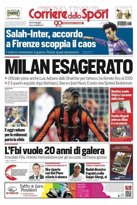 Corretta la prima pagina di oggi, venerdì 3 luglio, del Corriere dello Sport dopo il clamoroso errore relativo alla foto di Luiz Adriano (clicca qui per approfondire). Nella ristampa in primo piano c’è comunque la notizia del nuovo acquisto rossonero: “Milan esagerato. Ufficiale: preso anche Luiz Adriano dallo Shakhtar, ha firmato fino al 2020“. In taglio alto spazio alla querelle Salah: “Salah-Inter, c’è l’accordo. E a Firenze scoppia il caos“.