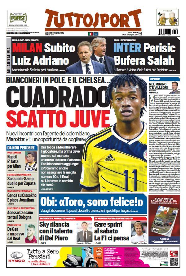 Importante notizia di mercato legata alla Juventus in primo piano quest’oggi, venerdì 3 luglio, sulla prima pagina di Tuttosport: “Cuadrado, scatto Juve“. Marotta conferma: “È un’opportunità ad cogliere“. In taglio alto spazio al Milan che ha ufficializzato Luiz Adriano dallo Shakhtar e all’Inter che è molto vicina al croato Perisic.