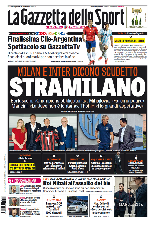 È un gioco di parole il titolo in primo piano sulla prima pagina di oggi, sabato 4 luglio, della Gazzetta dello Sport: “StraMilano, Inter e Milan dicono scudetto“. Rossoneri e nerazzurri lanciano, attraverso i propri allenatori Mihajlovic e Mancini, la sfida alla Juventus.