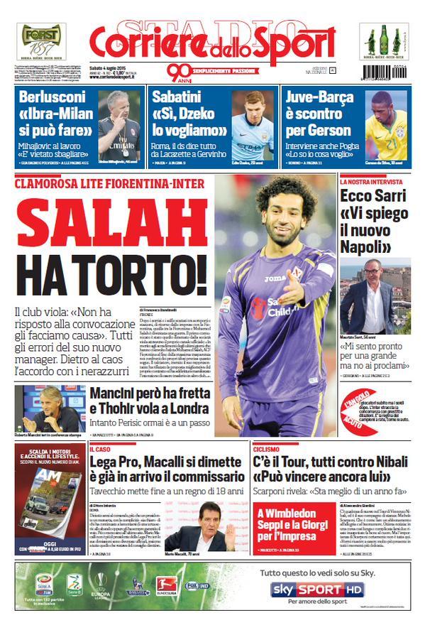 Tiene ancora banco la questione Salah quest’oggi, sabato 4 luglio, sulla prima pagina del Corriere dello Sport: “Salah ha torto! Clamorosa lite tra Inter e Fiorentina“. Il club viola farà causa all’egiziano che non ha risposto alla convocazione per il ritiro, alla base di tutto ci sarebbe un accordo con l’Inter. Mancini intanto mette fretta a Thohir che nei prossimi giorni dovrebbe chiudere per Perisic.