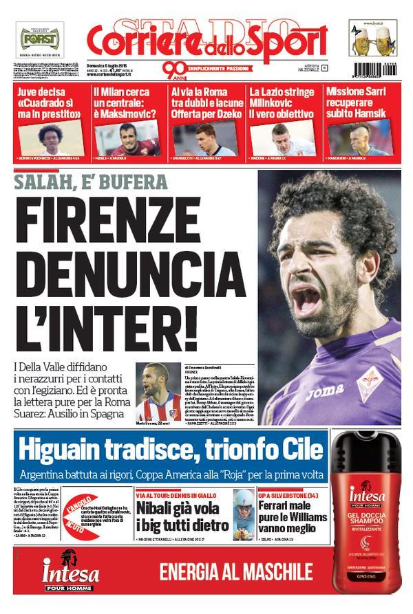 “Firenze denuncia l’Inter!“, questo il titolo in prima pagina sull’edizione di oggi, domenica 5 luglio, del Corriere dello Sport. I Della Valle diffidano i nerazzurri per i contatti con l’egiziano. Pronta una lettere anche per la Roma. In taglio basso spazio alla Coppa America con il Cile vincitore ai danni dell’Argentina per 4-1 dopo i calci di rigore: “Higuain tradisce, trionfo Cile. La Copa alla Roja per la prima volta“.