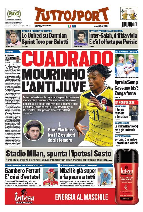 Juventus in primo piano sulla prima pagina di oggi, domenica 5 luglio, di Tuttosport: “Cuadrado, è Mourinho l’antiJuve“. Marotta vorrebbe il colombiano in prestito ma il tecnico del Chelsea, antico nemico dei bianconeri, ha dato mandato di cederlo solo a titolo definitivo.