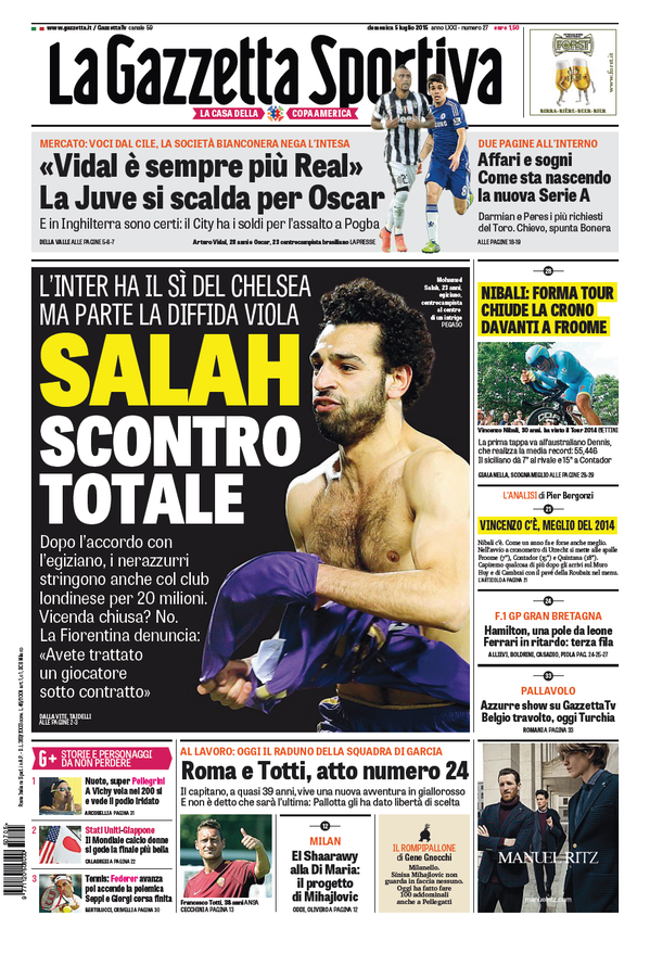 Si apre con un simpatico gioco di parole la prima pagina di oggi, domenica 5 luglio, della Gazzetta dello Sport: “Salah scontro totale. L’Inter ha il sì del Chelsea, ma parte la diffida viola“. Dopo l’accordo con l’egiziano, i nerazzurri stringono anche col club londinese per 20 milioni. La Fiorentina denuncia: “Avete trattato un giocatore sotto contratto“.