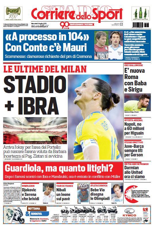 Notizie riguardanti il Milan sulla prima pagina di oggi, mercoledì 8 luglio, del Corriere dello Sport: “Le ultime del Milan: stadio più Ibra“. Arriva l’okay per l’area del Portello, si può realizzare il progetto di Barbara. Incertezza al Psg, Zlatan si avvicina. In taglio alto il calcioscommesse con le richieste del pm di Cremona: “A processo in 104, ci sono anche Conte e Mauri“.